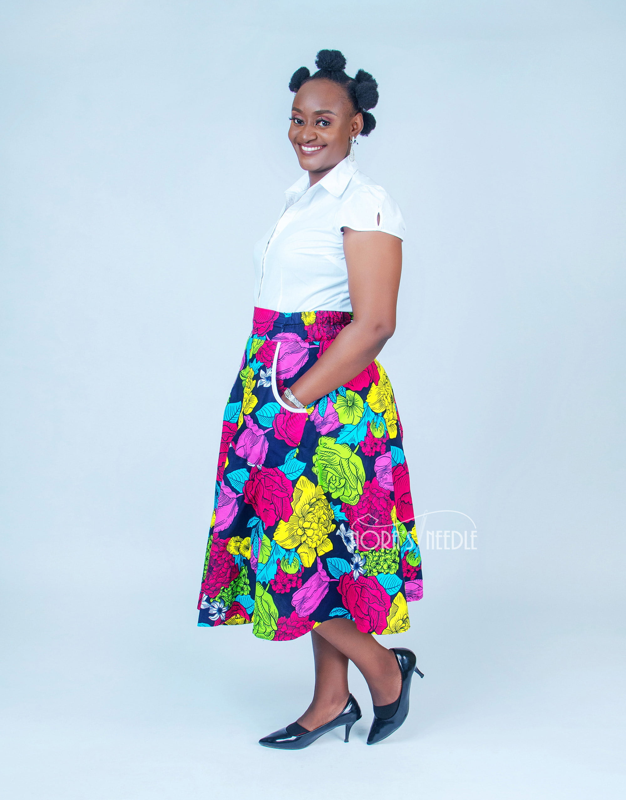 Happy African print high waist circle skirt. Handmade in Lagos Nigeria from 100% African print cotton fabric, this flowery skirt has the following features: